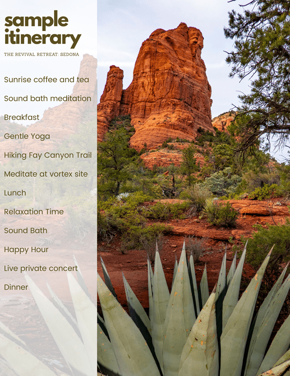 A Revival Retreat encompasses simple pleasures - outdoor exploration, slowing down, experiencing live music and enjoying fantastic food. When you take a step away from real life, these experiences allow you to rediscover a part of yourself. In Sedona we will let the power of the red rocks ground us so that we feel connected to self and able to receive JOY!